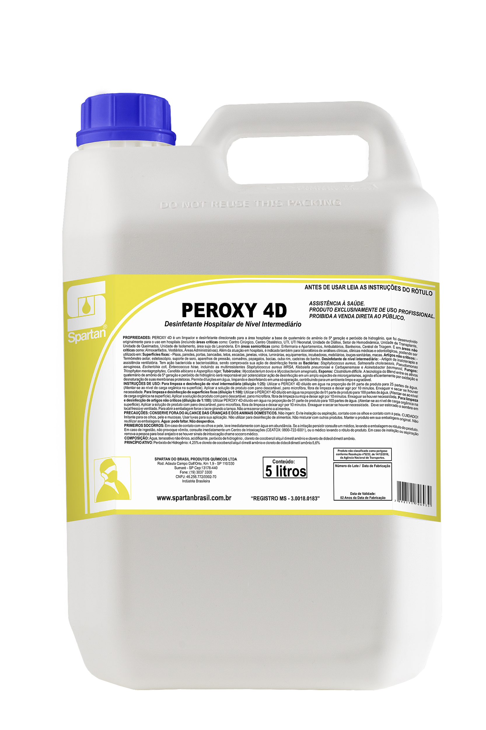 PEROXY 4D é um desinfetante de nível intermediário, indicado para artigos de inaloterapia e assistência ventilatória. PEROXY 4D tem ação bactericida e bacteriostática, agindo com eficácia sobre as bactérias gram-positivas e gram-negativas.