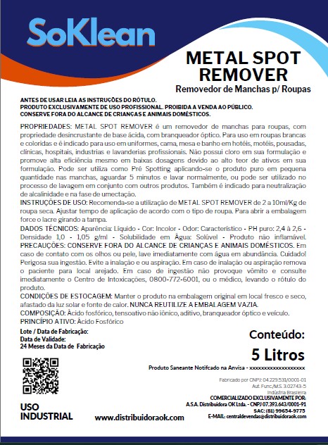 Removedor para manchas de origem metálica (como ferrugem, oxidação, resíduos de cobre, bronze ou alumínio) que frequentemente aparecem em roupas após lavagens ou contato com objetos metálicos. O produto é formulado com agentes quelantes e antioxidantes que quebram quimicamente os compostos metálicos sem danificar tecidos.